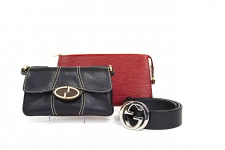 3036. Gucci et Louis Vuitton, deux pochettes et une ceinture