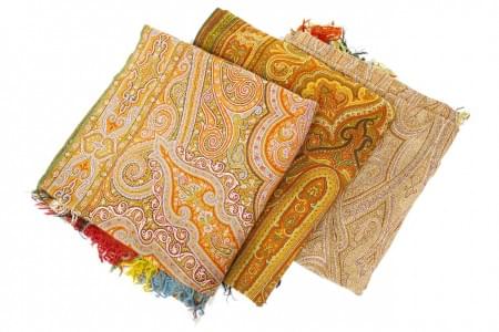 Soie à fond ocre, jaune et vert, L env. 149 cm