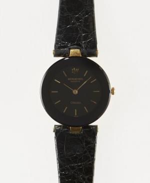 Cadran noir, aiguilles et chiffres romains dorés, remontoir sert...