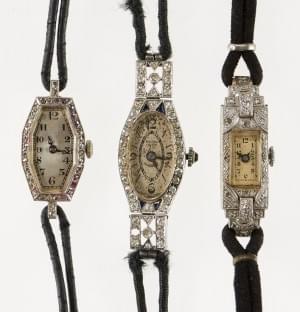 3096. Lot de trois montres Art déco serties de diamants et roses de di...
