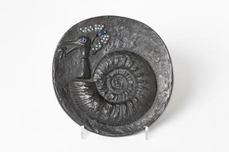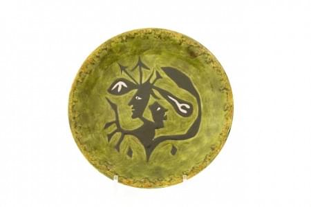Assiette à décor de visages noirs sur fond olive, céramique émai...