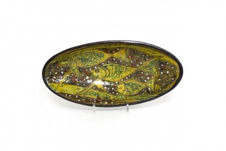 Plat navette à décor de poissons, céramique émaillée brun et ver...