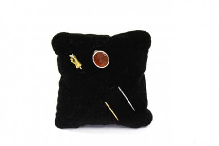 Or 750, H 6 cm. On joint une épingle en argent sertie d'une inta...
