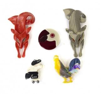 3166. Léa Stein, lot de cinq broches à motif de deux loups, un coq, un...