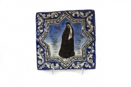 Céramique émaillée bleu à décor d'une figure voilée, 23x23 cm