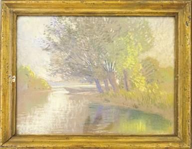 Vue d'un bord de rivière, pastel sur papier, signé, 25x30 cm