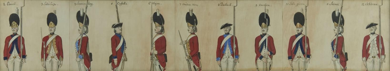 11 figures de régiments suisses, aquarelle s...