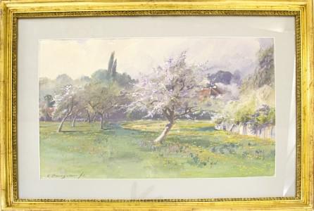 Pommier en fleurs, aquarelle sur papier, signée, 30x47 cm