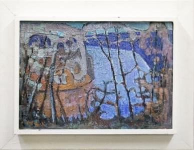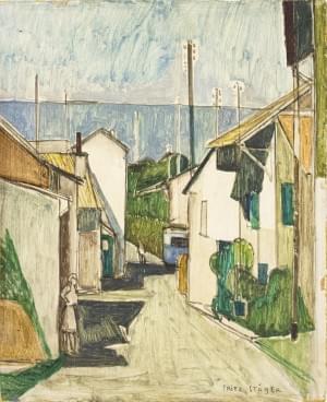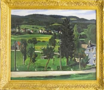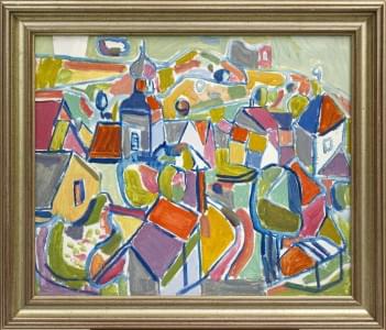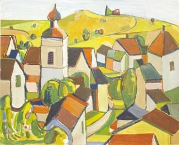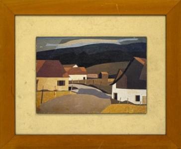 Vue du village, huile sur pavatex, 65x54 cm. On joint une affich...