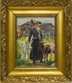 Paysanne valaisanne aux chèvres, huile sur panneau, monogrammée...