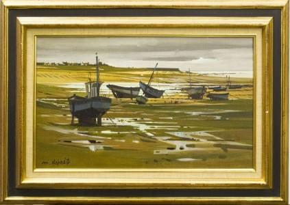 Bateaux à marée basse aux Sables Blancs en Bretagne, huile sur t...