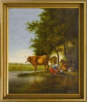 Scène animée au bord d'un lac, huile sur toile, signée et datée...