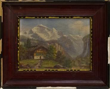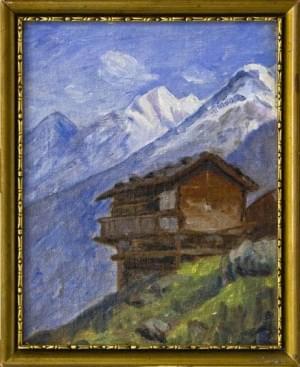 Vue d'un chalet dans les montagnes, huile sur carton, monogrammé...