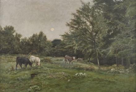 Vaches au pâturage sous la lune, huile sur toile, signée, 43x62...