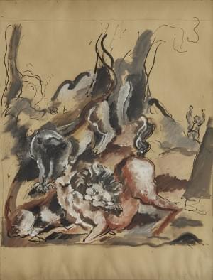 Atalante et Hippocrate et combat d'animaux, deux gouaches sur pa...