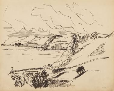 Trois esquisses à la plume figurant des paysages, encre sur papi...