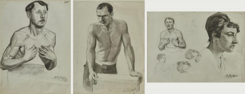 Trois esquisses de personnages, mine de plomb, signées et datées...