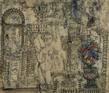Architectures avec divinités, encre et aquarelle sur papier, sig...