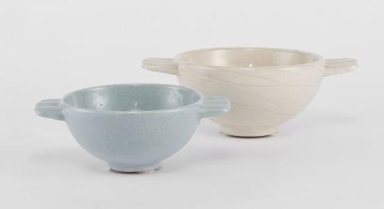 Deux bols à anses latérales, céramique émaillée céladon clair et...
