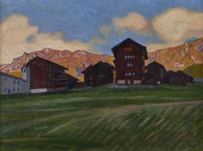 Village valaisan, huile sur carton, cachet de l'atelier au dos,...