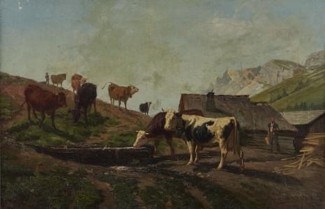 Etable avec des vaches au pâturage, huile sur toile, signée et d...