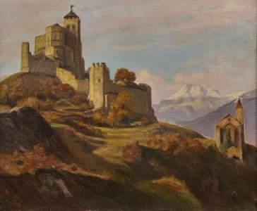 Vue de la Basilique de Valère à Sion, huile sur toile, signée, 3...