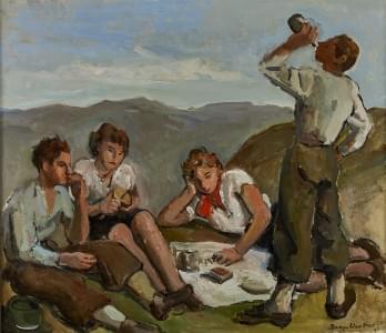 Pique-nique dans la montagne, huile sur toile, signée et datée 3...