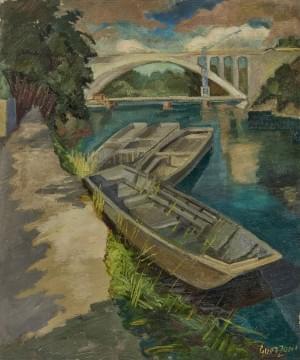 Les barques sur l'Arve, huile sur toile, signée, 65x54 cm