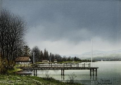 Le Grütli, huile sur toile, signée, 33x41,5 cm