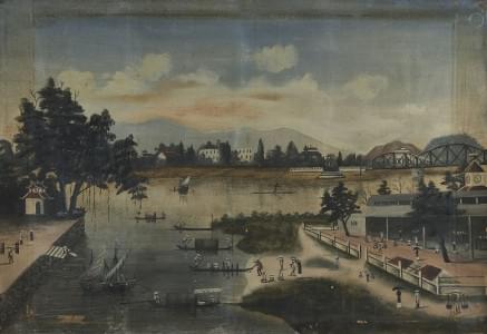 Paysage fluvial en Indochine, gouache sur papier, 55x80 cm