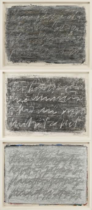 Hachures sur fond gris, suite de trois huiles sur papier, 56x75...