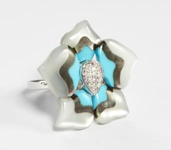 3206. Bague fleur sertie de motifs en nacre centrés d'un motif pavé de...