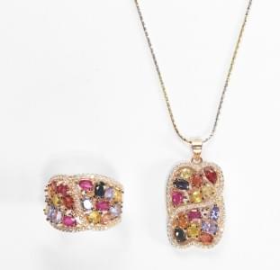 3217. 6976/6971*Lot d'un collier et d'une bague pavés de saphirs de co...