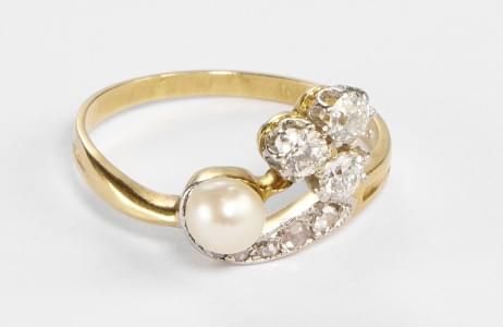 3218. Bague sertie d'une perle rehaussée de trois diamants taille anci...