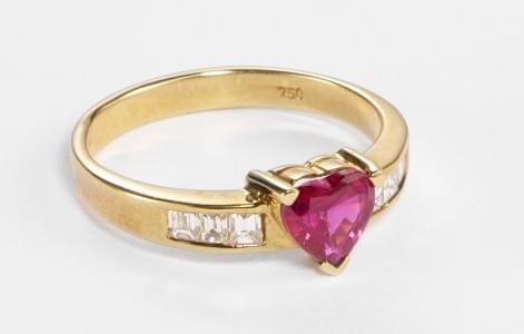 3222. Bague centrée d'un rubis taille cœur épaulé de diamants taille p...