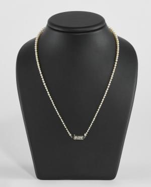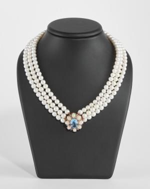 3229. *Collier de trois rangs de perles centré d'un motif serti d'une...
