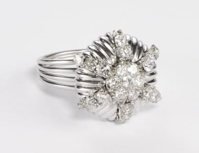 3226. Bague godronnée stylisée centrée d'un motif serti de diamants re...