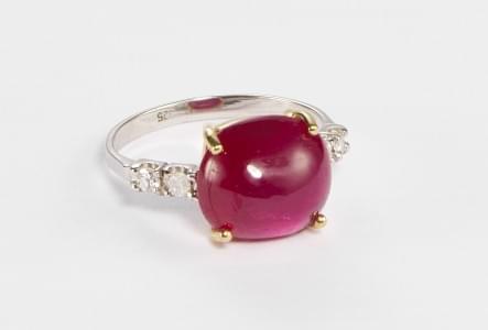 3232. 6336*Bague sertie d'un rubis taille cabochon épaulé de diamants