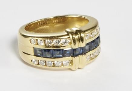 3243. Bague sertie d'une ligne de saphirs calibrés rehaussés de part e...