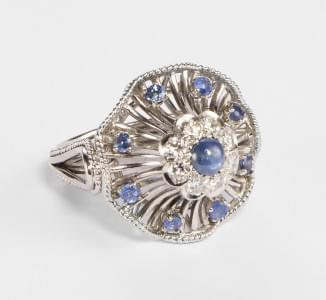 3245. Bague "pagode" ajourée centrée d'un saphir taille cabochon entou...