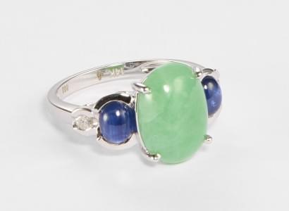 3254. *Bague sertie d'un jade taille cabochon ovale épaulé de saphirs...
