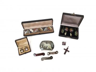 3279. Lot de bijoux émaillés comprenant: Un bracelet, une boucle de ce...