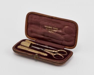 Ecrin Feuillebois, comprenant: étui à aiguilles, ciseaux, dé et...