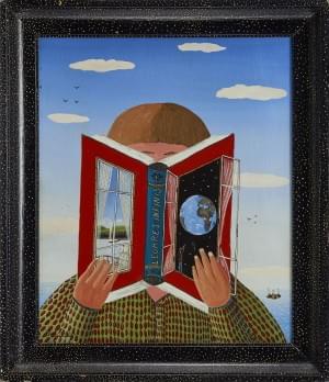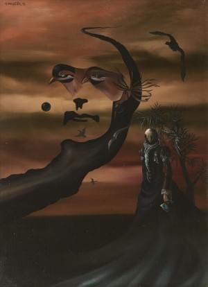 Portrait de femme et oiseaux surréalistes, huile sur toile, sign...