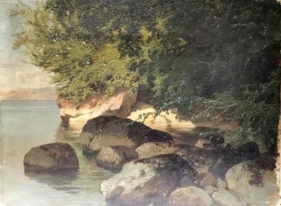 Rocher au bord de l'eau, huile sur toile, 23x29 cm