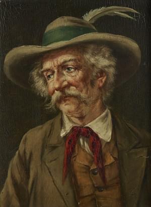 Portrait de vieil homme avec un chapeau à plume, huile sur panne...