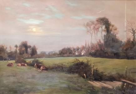 Vaches au pré, huile sur toile, signée et datée 1920, 38x60 cm