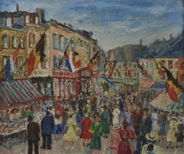 Rue bondée, huile sur toile, signée A. Jacob, 50x60 cm