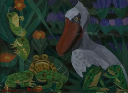 Crapauds et volatile, huile sur isorel, 48x64 cm