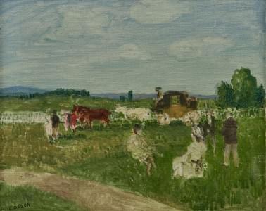 Paysans près de la mare, huile sur papier marouflée sur panneau,...